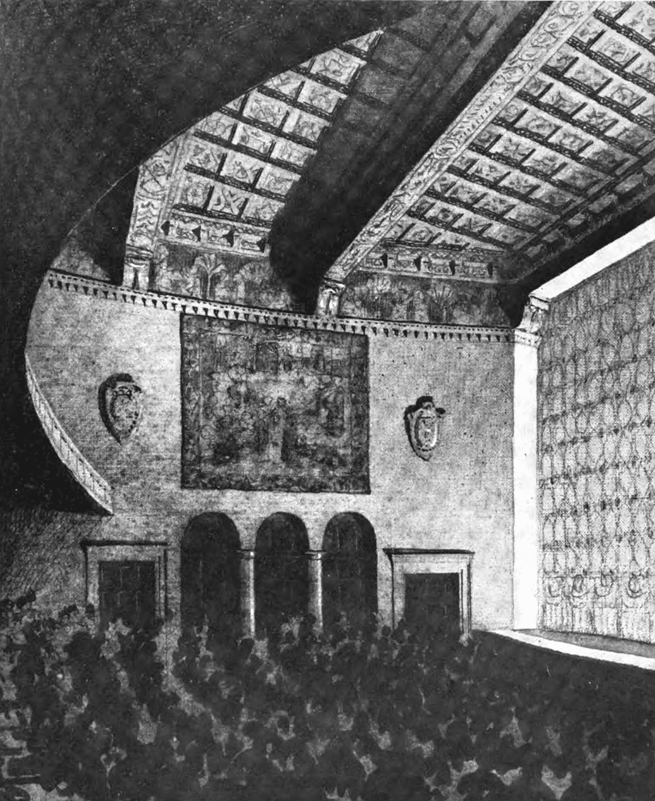 The interior blends functionality with opulence. The audience chamber seats approximately 1,225 people, featuring a sloped floor, plush carpets, and tapestry-upholstered seating. The stage, wider and deeper than most of its time, measures 38 feet in width, 49 feet in depth, and 77 feet across the proscenium. Its spacious design earned it the distinction of being one of New York’s largest stages upon opening.